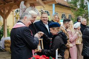 Szczególnym momentem uroczystości było przekazanie Betlejemskiego Światła Pokoju. Harcerska delegacja uroczyście wręczyła płomień na ręce Burmistrz Andrychowa, Pani Beaty Smolec, symbolicznie dzieląc się przesłaniem pokoju, nadziei i dobra z całą lokalną społecznością. Płomień otrzymała także Pani Ewelina Szypuła, Przewodnicząca Rady Miejskiej w Andrychowie oraz ksiądz Tomasz Bieniek, Proboszcz Parafii św. Macieja w Andrychowie.